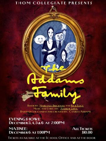 Thom Collegiate Presents: The Addams Family Musical December 3, 4, 5 & 6 - 7:00 pm December 6 - Matinee - 1:00 pm Tickets - $10