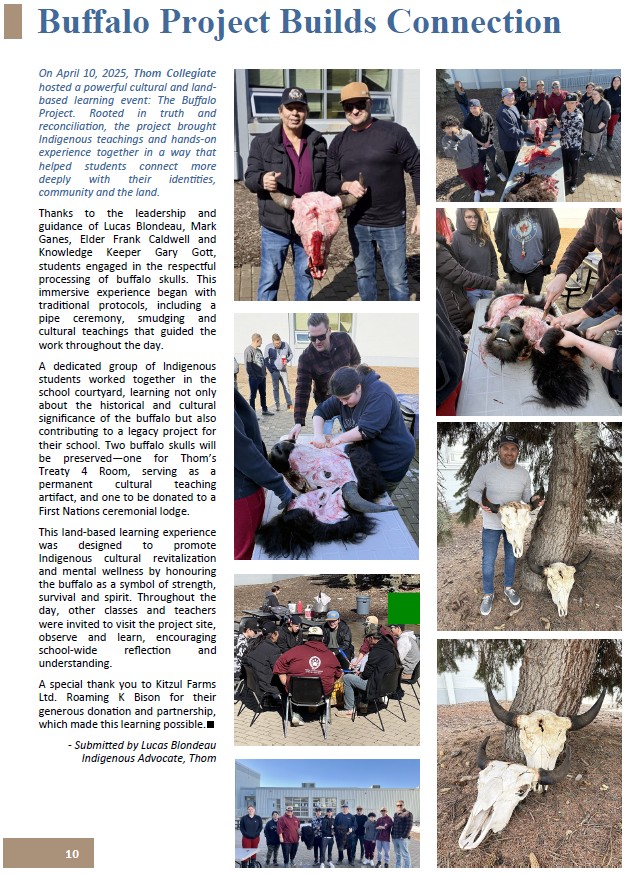 Last year, our students, guided by Lucas Blondeau, Elder Frank Caldwell, and Knowledge Keeper Gary Gott, engaged in the respectful processing of buffalo skulls. Rooted in traditional protocols—including pipe ceremonies and smudging—the project allowed students to connect with their identities and the land through the buffalo, a symbol of strength and survival.